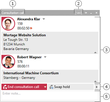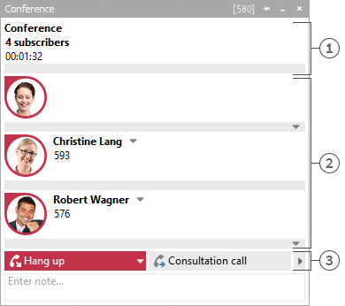 The call window is displayed in the format shown above as soon as you initiate a conference. You can no longer directly control the individual calls but only the conference which is displayed as the uppermost entry in the call list. How long the conference has been running is shown next to the number of conference participants. The further elements of of the call window are similar to those described above.